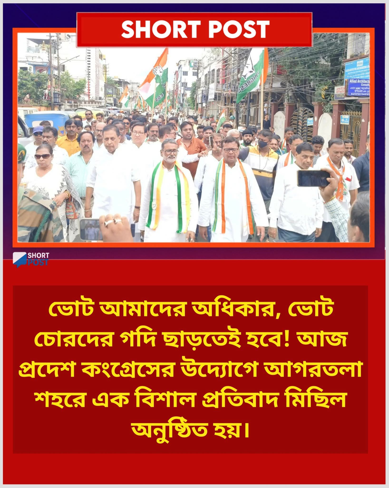 সম্প্রতি এই প্রেক্ষাপটে ত্রিপুরা প্রদেশ কংগ্রেস এক প্রতিবাদ মিছিলের আয়োজন করে আগরতলা শহরে। “ভোট আমাদের গণতান্ত্রিক অধিকার” – এই স্লোগানকে সামনে রেখে হাজারো কংগ্রেস কর্মী ও সাধারণ মানুষ মিছিলে অংশ নেন। তাঁদের দাবি ছিল স্পষ্ট – “ভোট চোরদের গদি ছাড়তেই হবে।”